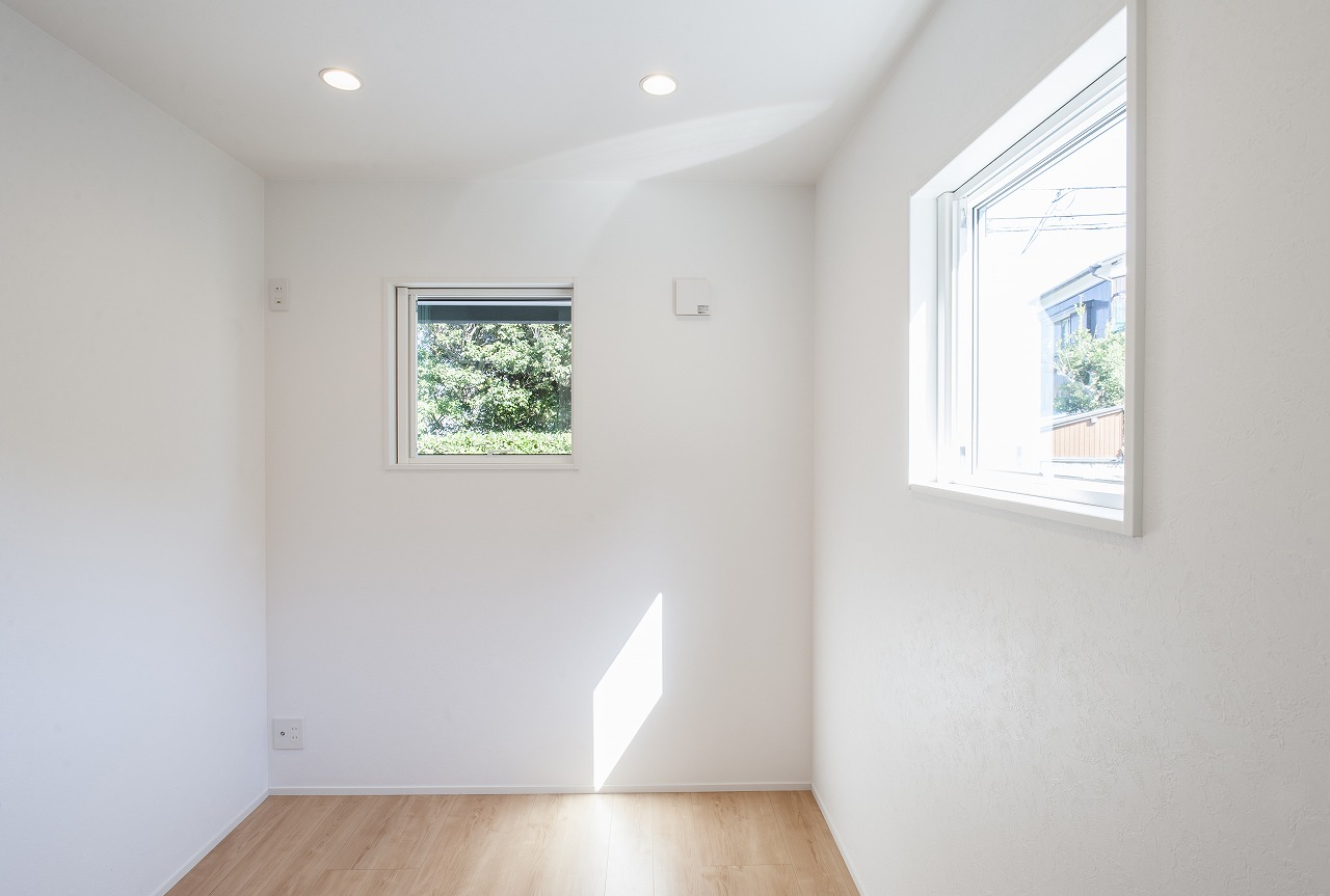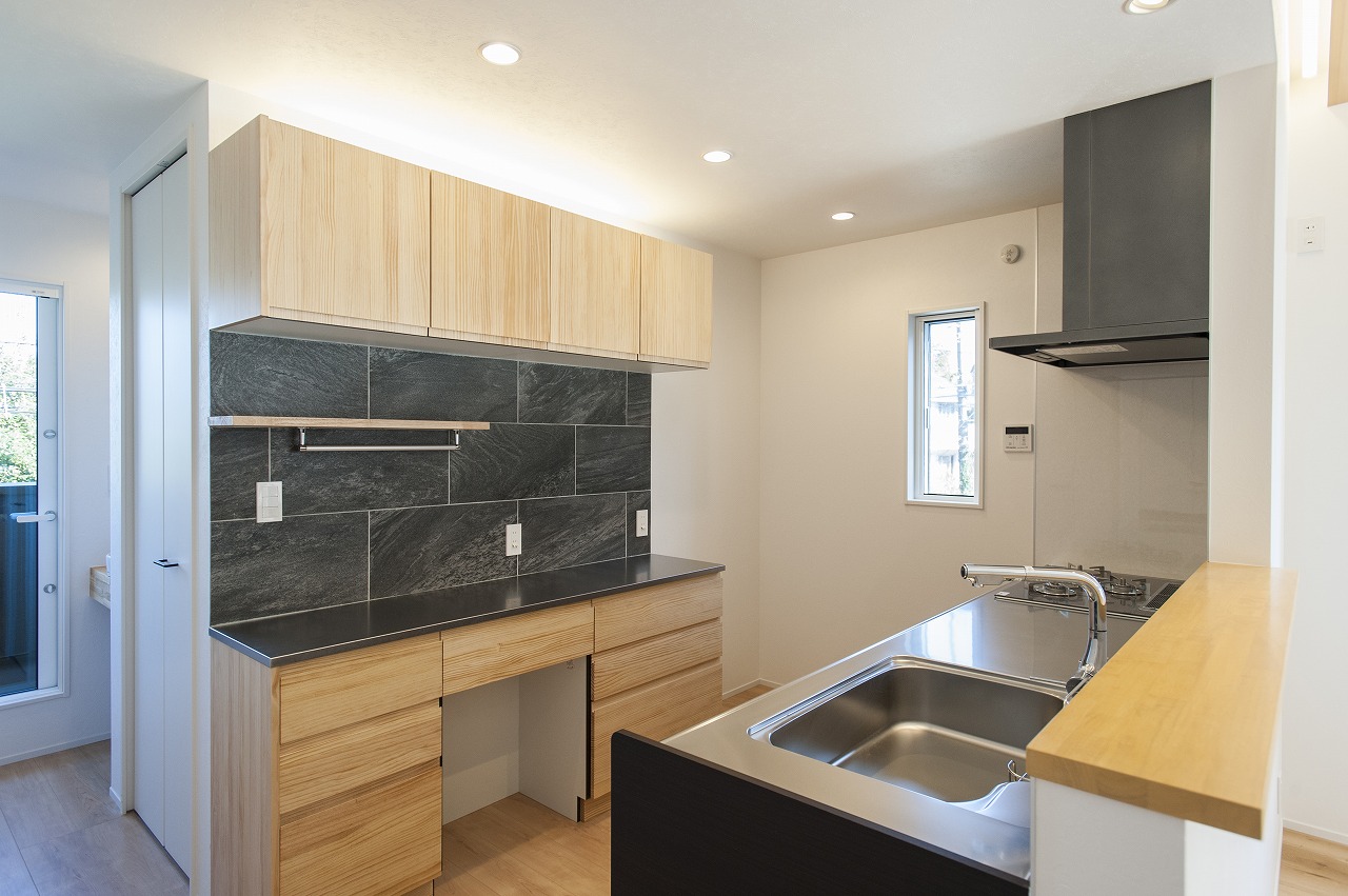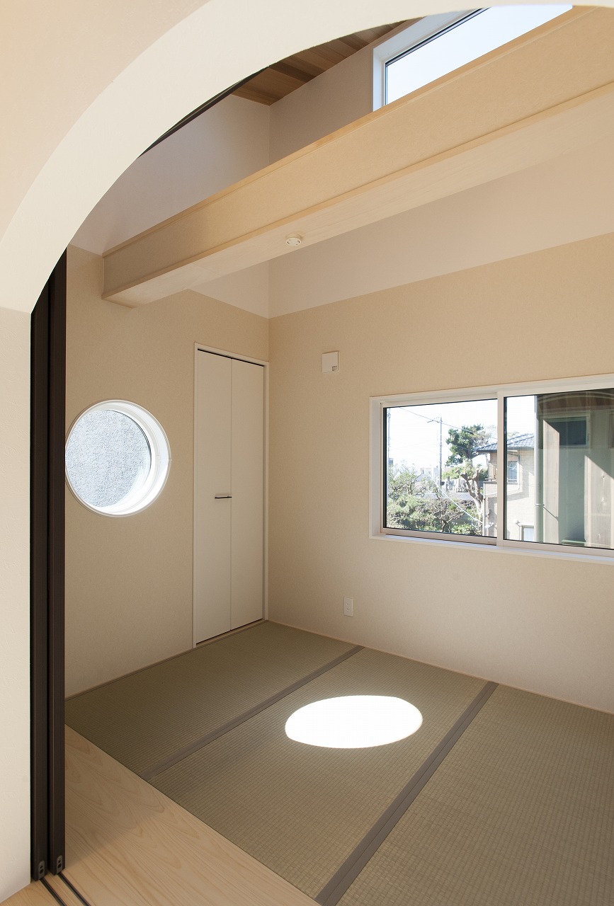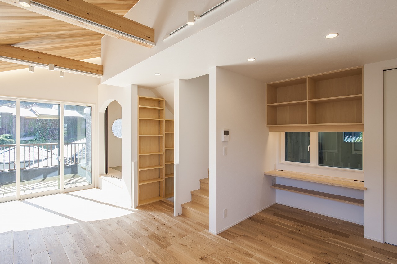 2階は仕切りのない開放的なリビングに。おむつ替えやお昼寝ができる和室。お絵描きや勉強ができるスタディカウンター。階段脇には本棚を。