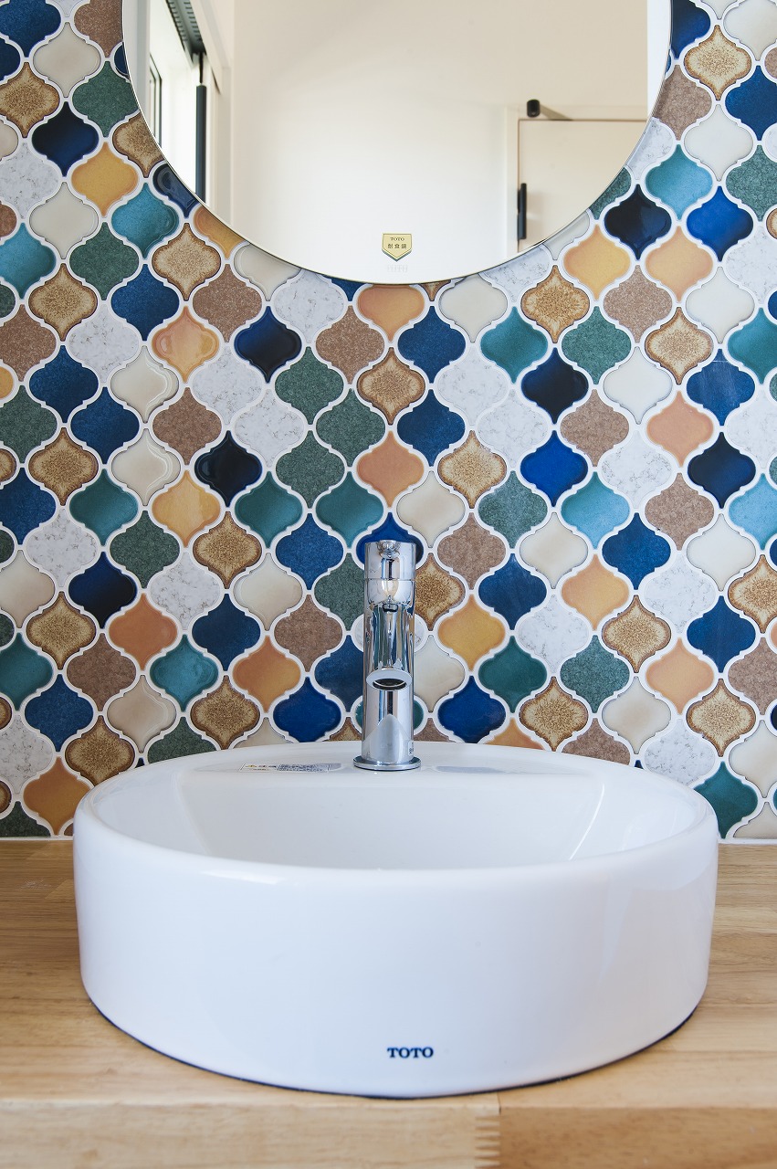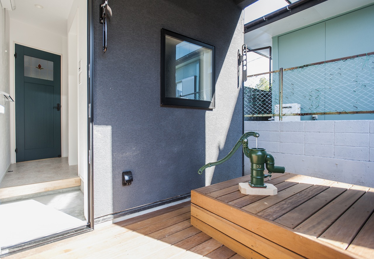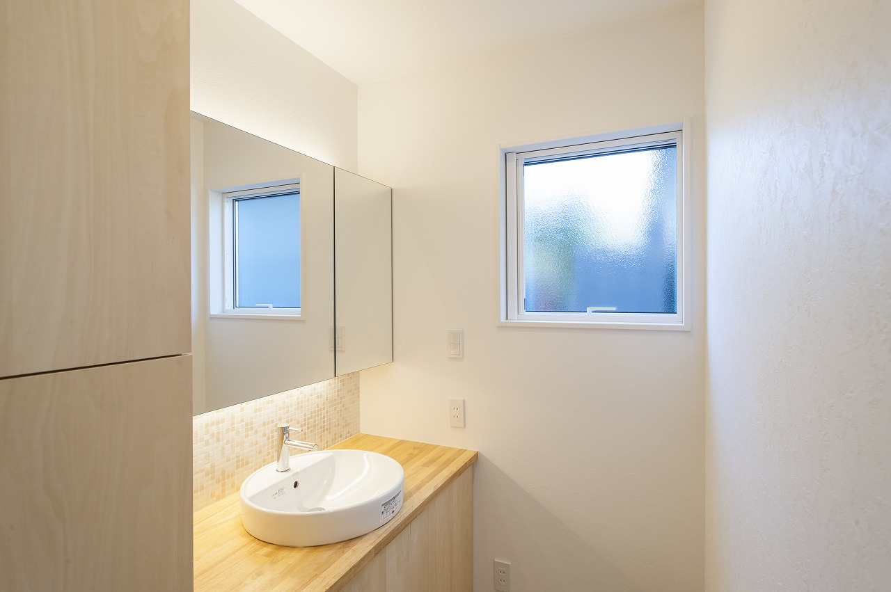 1階は洗濯に便利な機能を集約。洗濯機から裏のデッキに物干しして、取り込んだら隣りのファミリークローゼットへ。浴室も近いので着替えの動線も良好。2階の寛ぎ空間に対して使い勝手を優先してます。