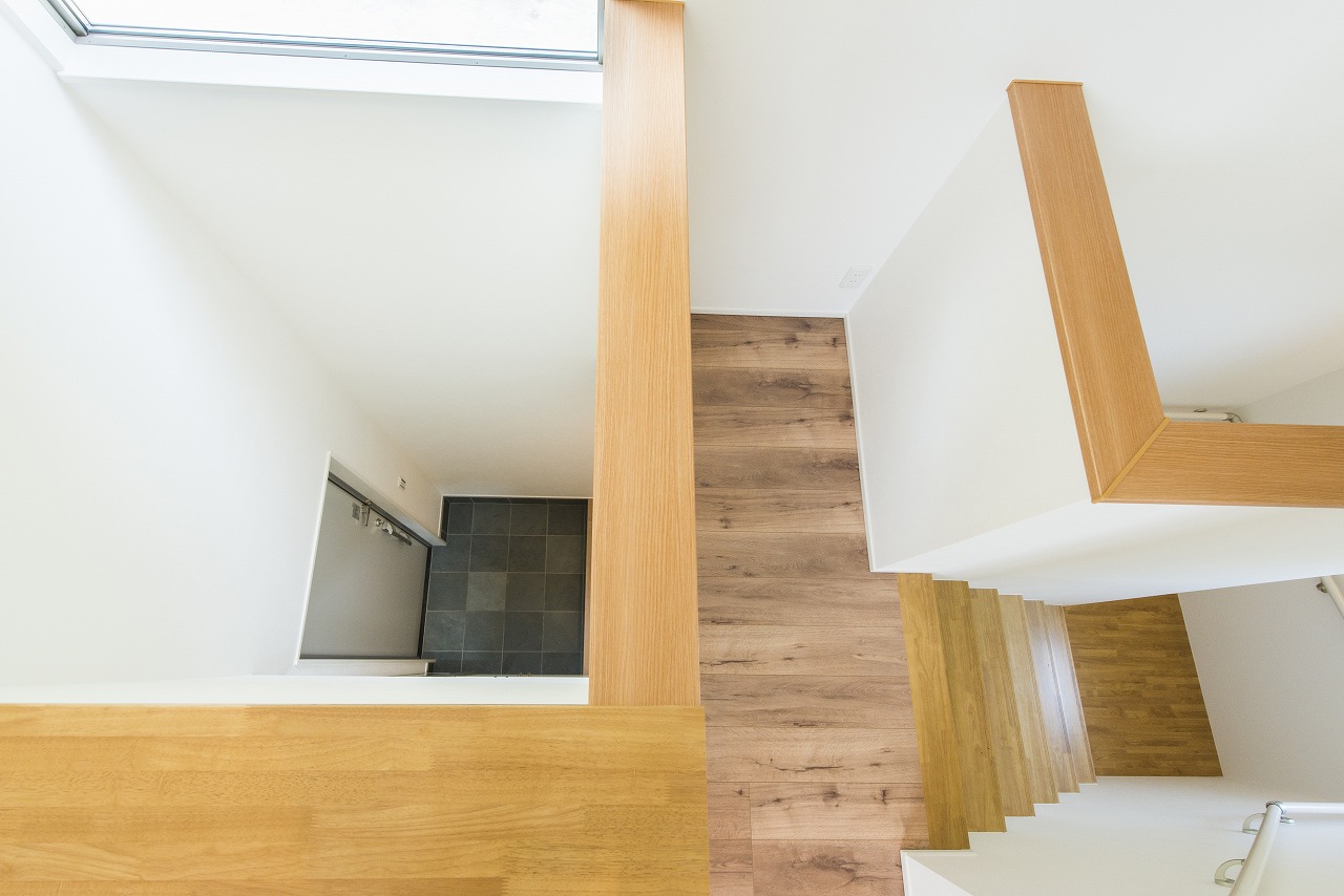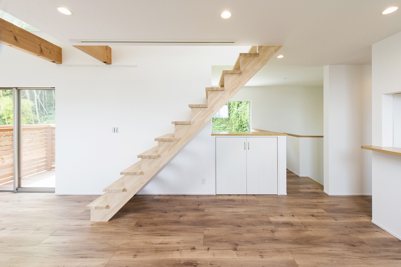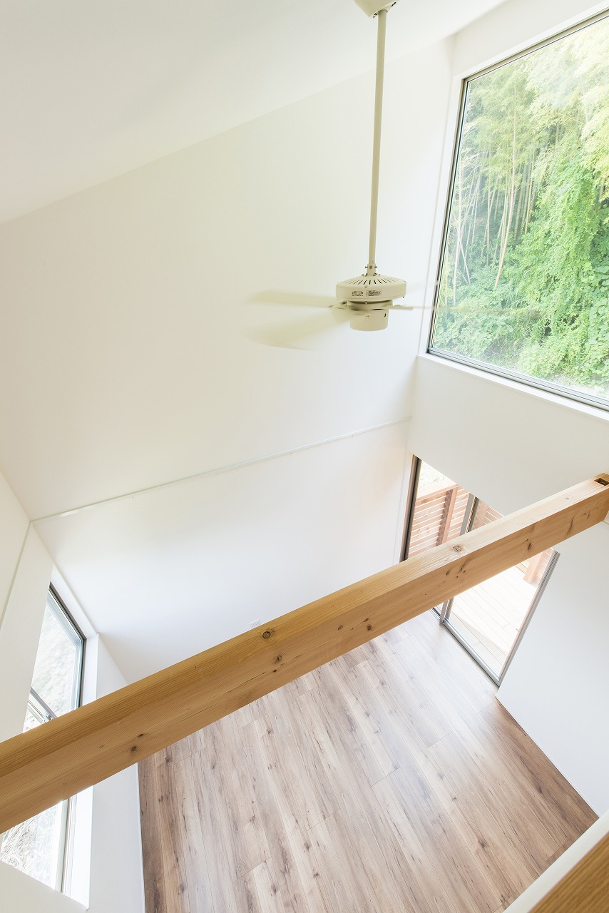 開放感のある吹き抜けのあるLDKや風景を切り取る大開口が魅力。周囲の自然に溶け込むように素材選びからこだわりデザインしました。