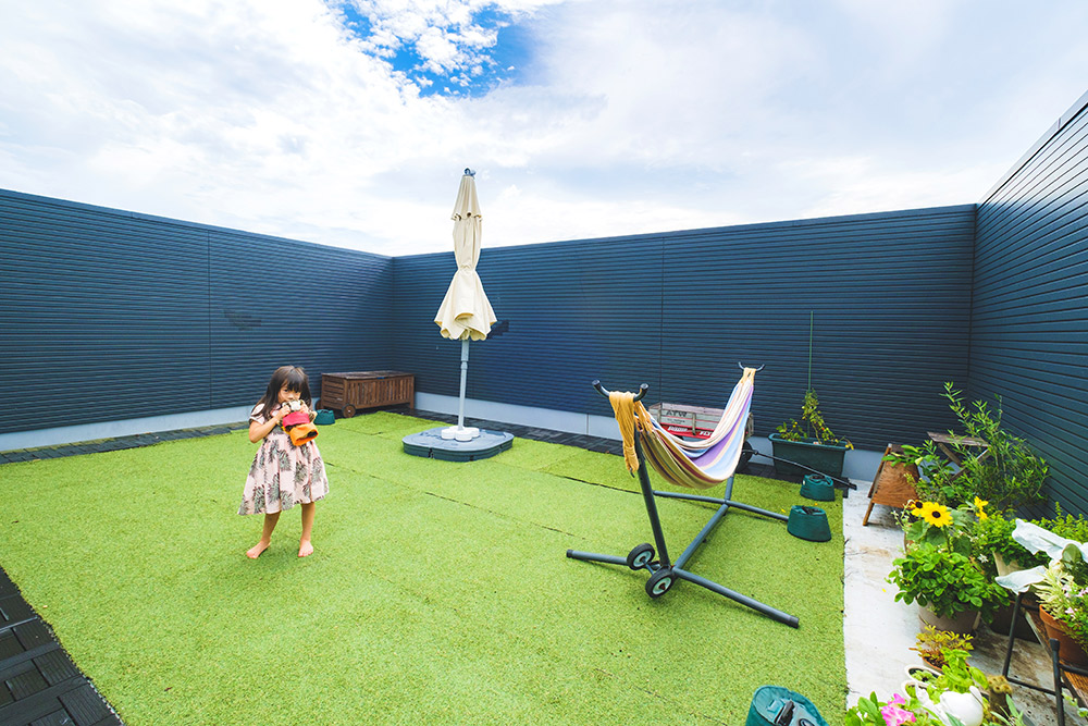 以下の施工事例のように、人工芝を敷き詰めることでお子さまや愛犬が走り回っても安全な空間を実現することが可能です。