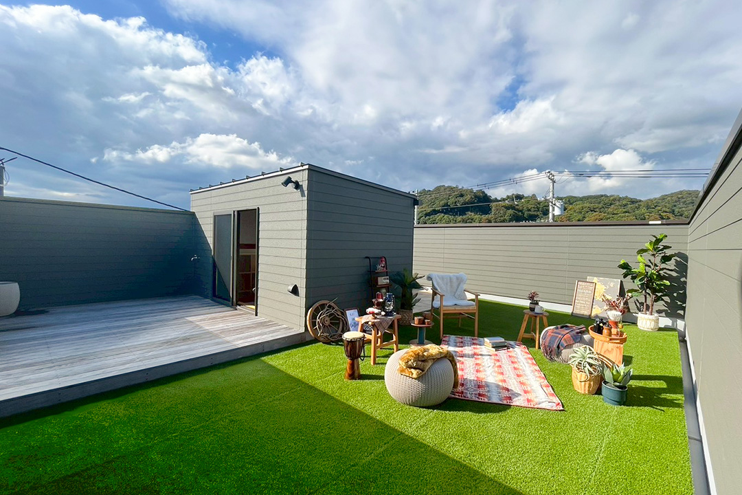 人工芝やタイル、ウッドデッキなど素材の切り替えで空間をデザイン