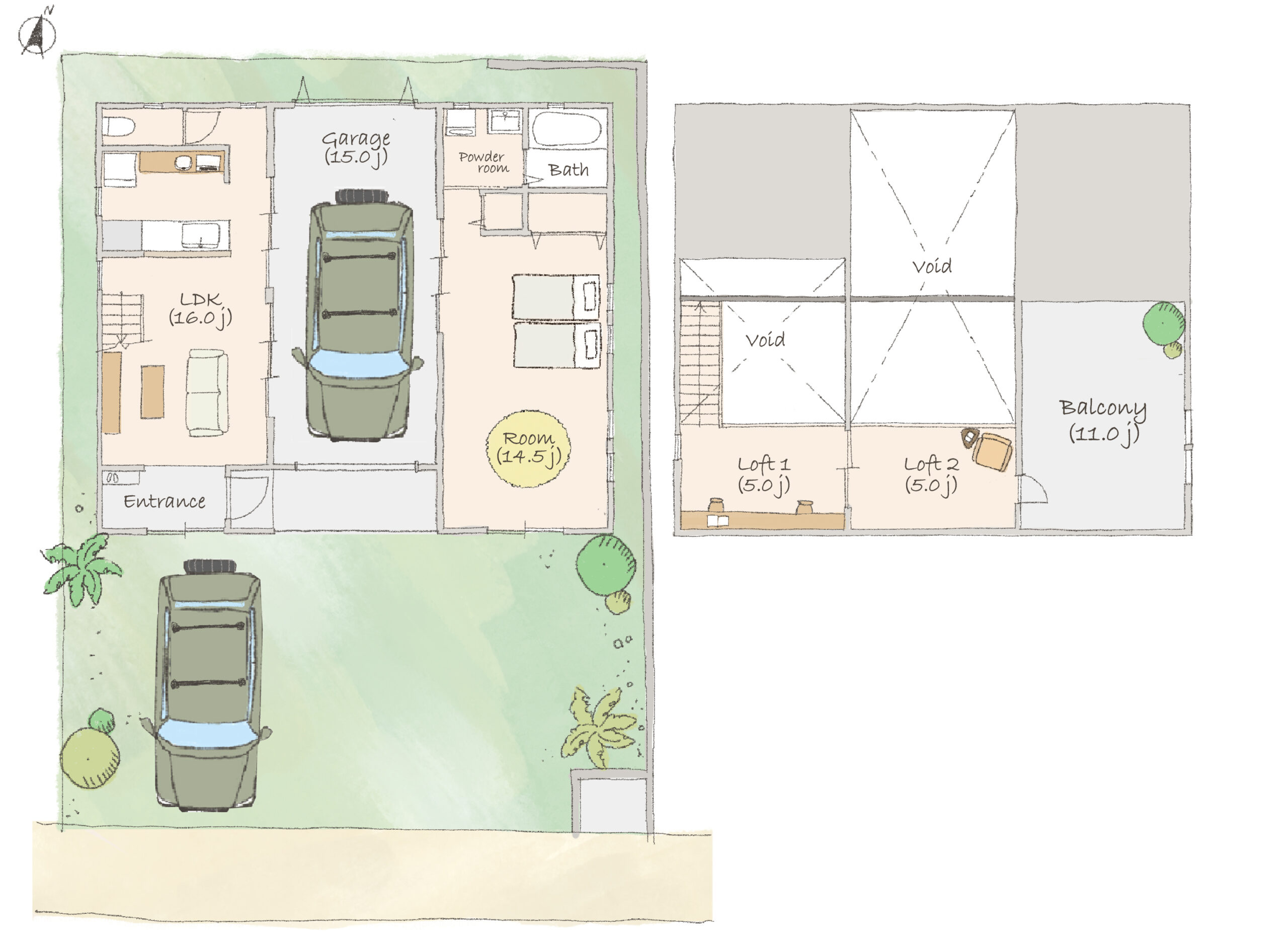 | 備考 | 建築確認番号/第2025SBC-確01729H号 間取詳細/1LDK +Garage +Loft×2 1F:ガレージ15.0帖、LDK16.0帖、洋間14.5帖、ロフト5.0帖×2、バルコニー11.0帖 ※掲載写真はイメージです。 |
