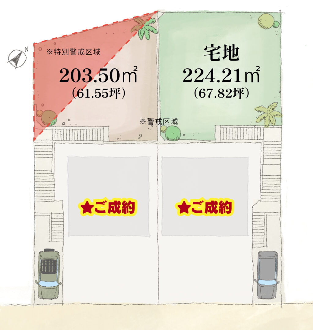 | 備考 | ※図面と現況が異なる場合は、現況優先とします。 ※東京電力他より、電柱・支柱の設置要望があった場合は敷地内に電柱・支柱が設置される場合があります ※土砂災害警戒区域内(一部 土砂災害特別警戒区域内)に指定されています |