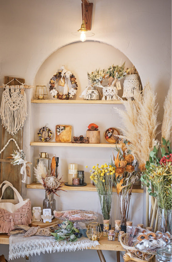 『syuiro』さんは、ドライフラワーアーティスト。ドライフラワーとプリザーブドフラワーを自在に使って、スタイリッシュなリースやスワッグ、ボタニカル雑貨などをつくっています。誕生日やお祝い事のプレゼントに花束をお願いするひとも多いとか。