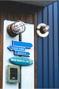 玄関先には、お洒落なアメリカンテイストの表札タワーがそびえています。「好きなデザインの表札やインターフォン、ポスト、照明を組み合わせました。『BEACH→』というプレートだけ矢印が海とは違う方向なんですが(笑)、すごく気に入ってるんですよ」と奥様。