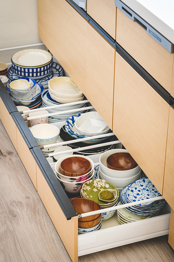 「キッチンはわたしがどうしても壁をタイルにしたかったから、それはオプションで。キッチン下にある引き出し仕様の収納が広くて食器類が全部入ったので、食器棚を置かなくて済んだのはうれしかったですね。あと、『+BOX』というオプションで、デッキに面した部屋をひとつ追加したんですが、そこの押し入れを半分のサイズにして、残り半分のスペースにパソコン用のデスクをつくってもらいました」。